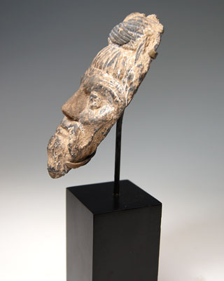 Condition:  The face is a fragment from a larger relief sculpture.  There is some mineral accumulation throughout, especially within the incised lines.  There is wear around the edge of the piece, and a small loss to the proper left eye.  Otherwise intact and in very good condition with custom mount.