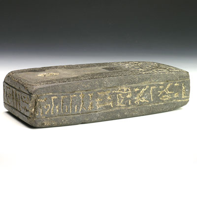 Condition: Hole for tenon at top rear, with faint outline of original piece (if you have an Isis bronze, this might fit beautifully) chip to base front right below script, small loss to script top side left, otherwise intact and in very good condition.