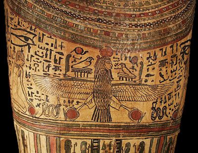The yellow background, adopted in the XXVIth Dynasty, imitates coffins of the late XVIIIth Dynasty with hieroglyphs applied in blue/black. Colours applied to the religious iconography are blue/green, red and black. Beneath the large wesekh collar is the central figure of a bearded ba bird facing the deceased’s left. It is shown crowned with solar disc, a tied head band and a beard ‘attached’ by a strap. Each claw grasps a shen (eternity) sign and maat (truth) feathers in each hand that face inwards. On either side of the ba, a hawk/falcon is shown seated upon a dias. The deity may represent Soped, Horus of Nekhen or Ra. Behind this deity is shown the sundisc with uraeus representing the god Ra.